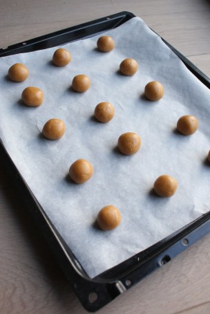 Rol balletjes, net iets groter als soepballetjes en verdeel ze gelijkmatig over een met bakpapier bekleedde bakplaat. Nu komt het leuke deel.